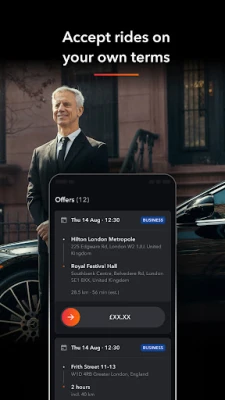 • Complete schedule control: Choose your rides through our offer system. Multiple ride types and vehicle categories let you shape your schedule. Select rides that fit your timeline, location, and fleet. We offer A-to-B transfers, hourly bookings, city-to-city rides, and more.