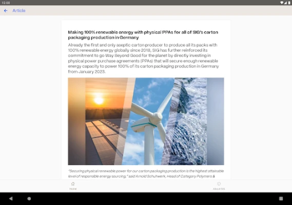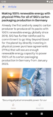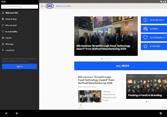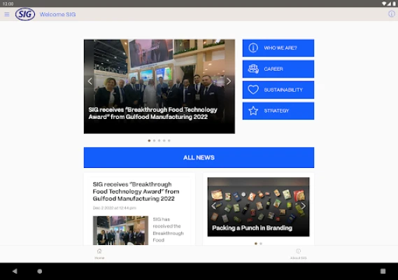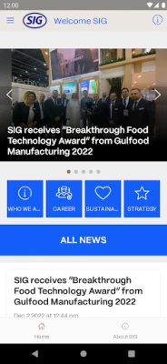SIG is a leading packaging solutions provider for a more sustainable world. We work in partnership with our customers to bring food products to consumers around the world in a safe, sustainable and affordable way. The app contains, among other things • current news from the company. • general information about the company and its portfolio. • an overview of SIG's goals and strategy. • an explanation of the company's sustainability strategy. • information about career opportunities as well as a listing of vacancies. • a listing of the company's locations.