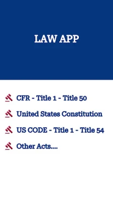 The Law App is a valuable tool for effortlessly accessing vital US legal information on your mobile device. It gives you access to the US Code, Regulations, Titles, Revised Statutes, and public law listings. Explore essential topics like Crimes and Criminal Procedure, Revenue Code, IRS and tax rules, FDA laws, Judicial Procedure, shipping rules, import/export requirements, Patents, Voting and Elections, Banking, Labor Laws, Fish & Wildlife protections, National Defense, the Constitution, and much more.